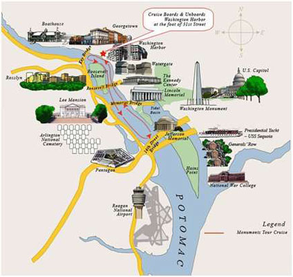 Từ quần thể kiến trúc này, nếu ta băng qua cầu Arlington Memorial Bridge, ngay tượng đài Lincohn Memorial, ta sẽ tới Arlington National Cemetery (Nghĩa trang Quốc gia). Và cũng từ tượng đài Lincohn Memorial, thay vì băng qua cầu để sang nghĩa trang Arlington, ta quẹo trái dọc theo bờ sông Potomac thì sẽ tới hồ Tidal ngay bên bờ sông Potomac và hồ được ăn thông với sông này. Quanh bờ hồ Tidal là một quần thể kiến trúc thứ hai được xây đựng như Franklin Delano Rosevelt Memorial, George Mason National Memorial và tượng đài Thomas Jefferson Memorial rất đẹp, tráng lệ không thua gì tượng đài Lincohn.